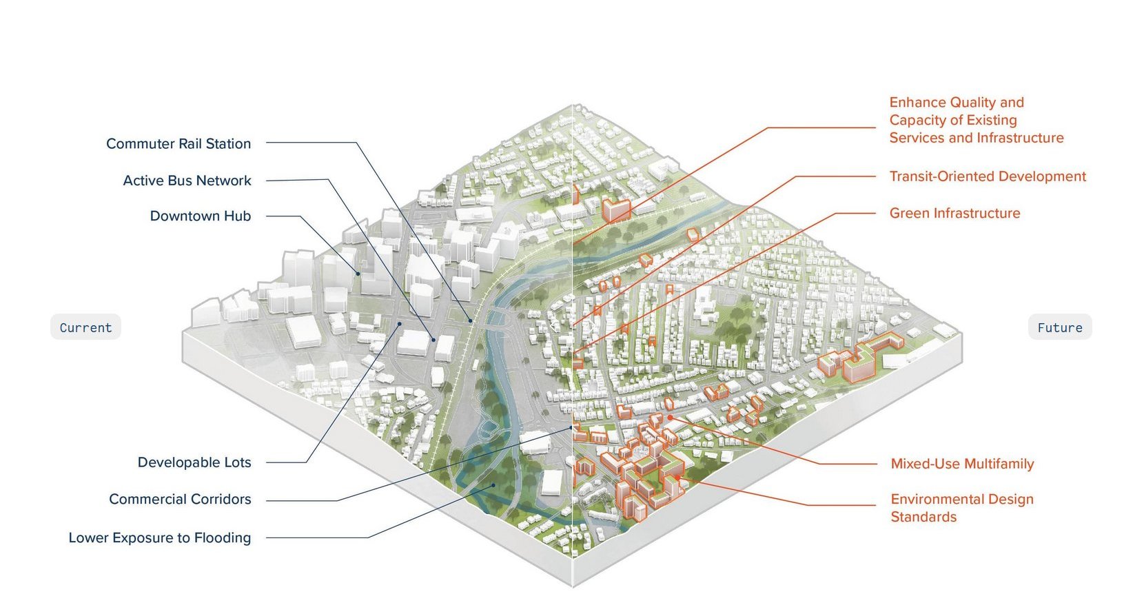 For New York’s Westchester County and Long Island communities, Bronin’s collaborative report with Cornell Atkinson and the Regional Plan Association illustrates these problems and potential solutions with graphics like the one below. According to the report, the current residential zoning development capacity allows less than half of the total housing needed by 2040, leaving a net gap between likely demand and what zoning would allow of approximately 680,000 units. Zoning reform at federal, state, and local levels could fix that.