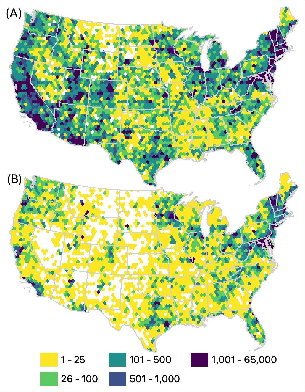 These maps illustrate where bee records have been submitted across the U.S., shown in 25 km hexagon grid cells.