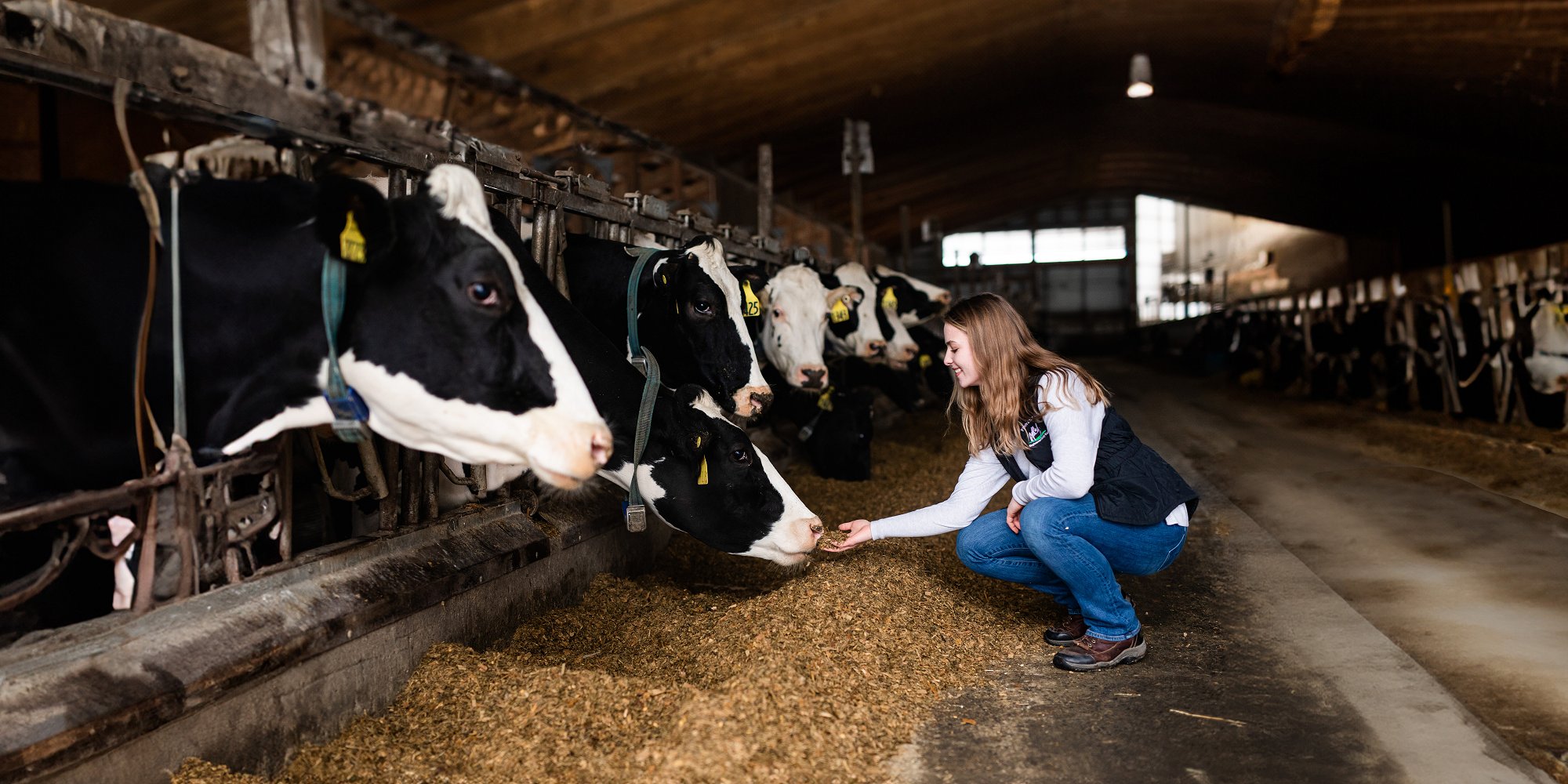 2019 Chobani Scholar Emily Starceski '23 kneels down to feed a cow at the Cornell University Dairy Research Center (UPhoto)