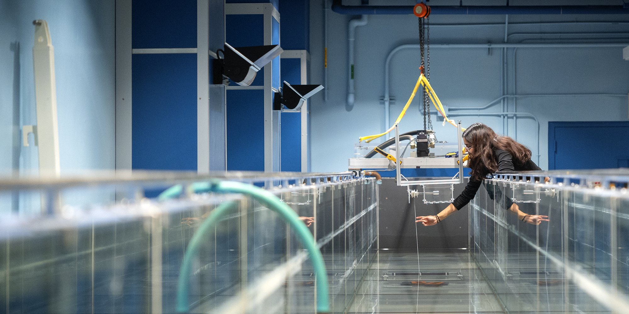 Kavya Mittha ’26 tests the wave energy conversion machine in the wave simulator tank for Maha Haji's SUMR grant from Cornell Atkinson