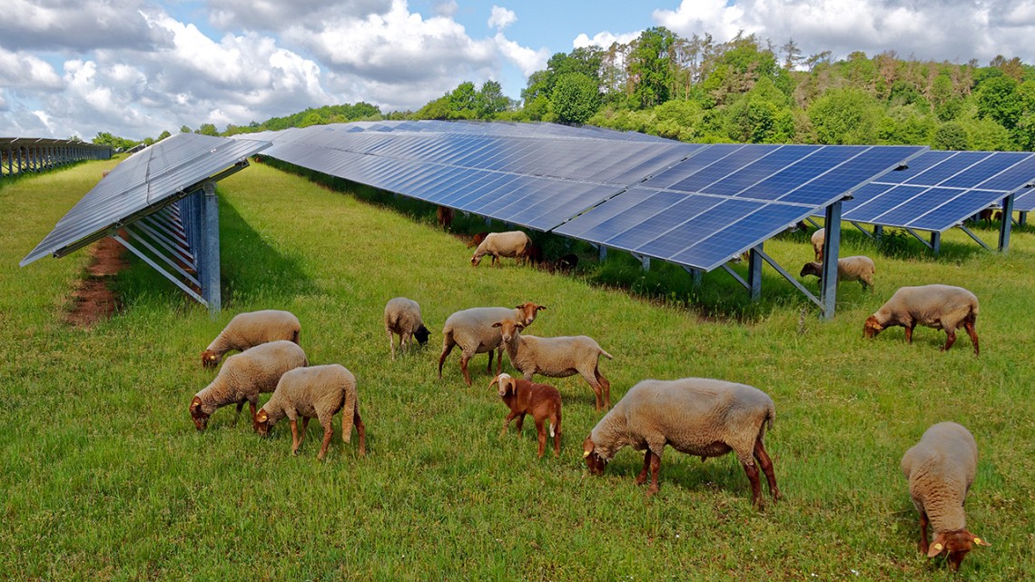 sheep grazing under solar panels