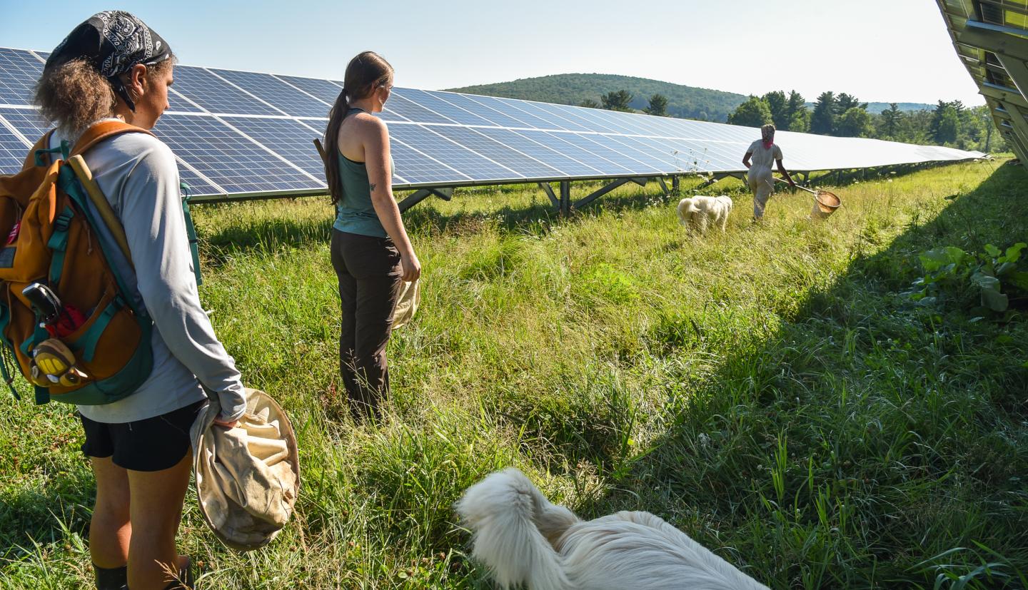 Students Milan Broughton ’24 and Claire Bloodnick MPS ’22 worked this summer on the Cornell Solar Grazing Project among solar arrays, grazing sheep, and livestock guardian dogs.